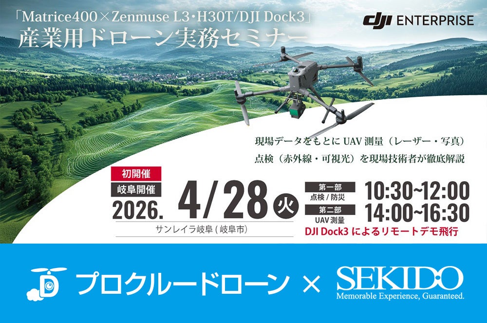 DJI(ディージェイアイ)正規販売代理店としてドローンビジネスの最前線を支える株式会社セキド(本社:東京都港区、代表取締役:大下貴之)は、株式会社プロクルー(本社:滋賀県長浜市、代表取締役:酒井正裕)と共催で、2026年4月28日(火)に岐阜県岐阜市で「産業用ドローン無料実演セミナー」を開催いたします。