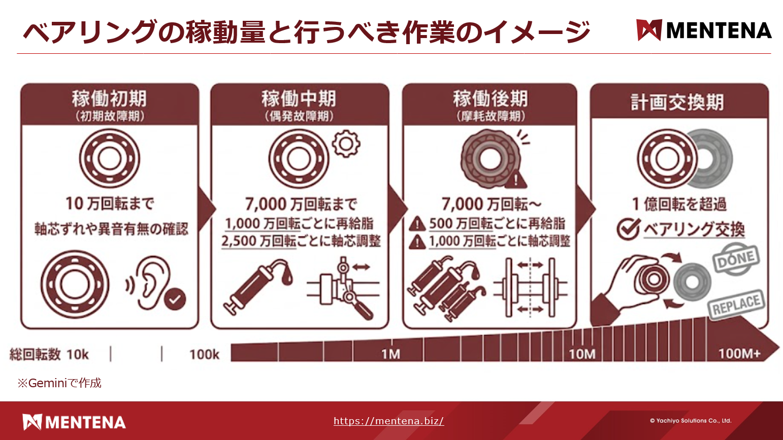 ①モーターやベアリングなどの駆動系の回転数を蓄積し、所定回転数ごとに調整や給脂・消耗品交換を行う