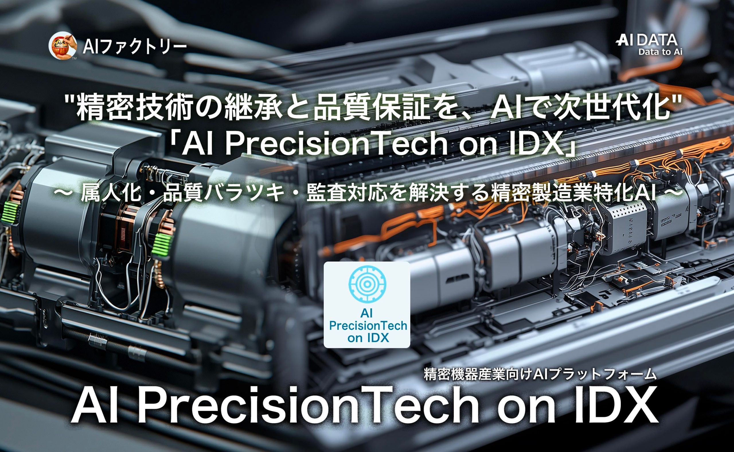 企業データとAIの利活用カンパニー、AIデータ株式会社(本社:東京都港区、代表取締役社長 佐々木隆仁、以下AIデータ社)は、精密機器メーカー・部品サプライヤー・駆動装置技術企業向けに、業界特化型AIソリューション『AI PrecisionTech on IDX』の提供を開始いたしました。