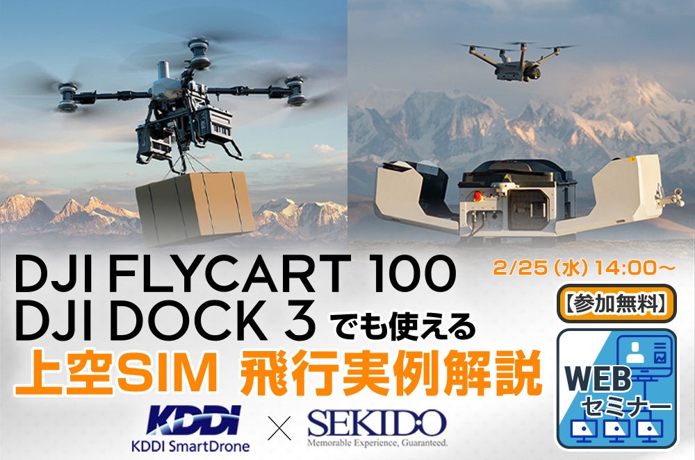DJI(ディージェイアイ)正規販売代理店としてドローンビジネスの最前線を支える株式会社セキド(本社:東京都港区、代表取締役:大下貴之)は、2026年2月25日(水)14時00分より無料WEBセミナー「DJI FLYCART 100/DJI DOCK 3でも使える 上空SIM 飛行実例解説WEBセミナー」を開催します。