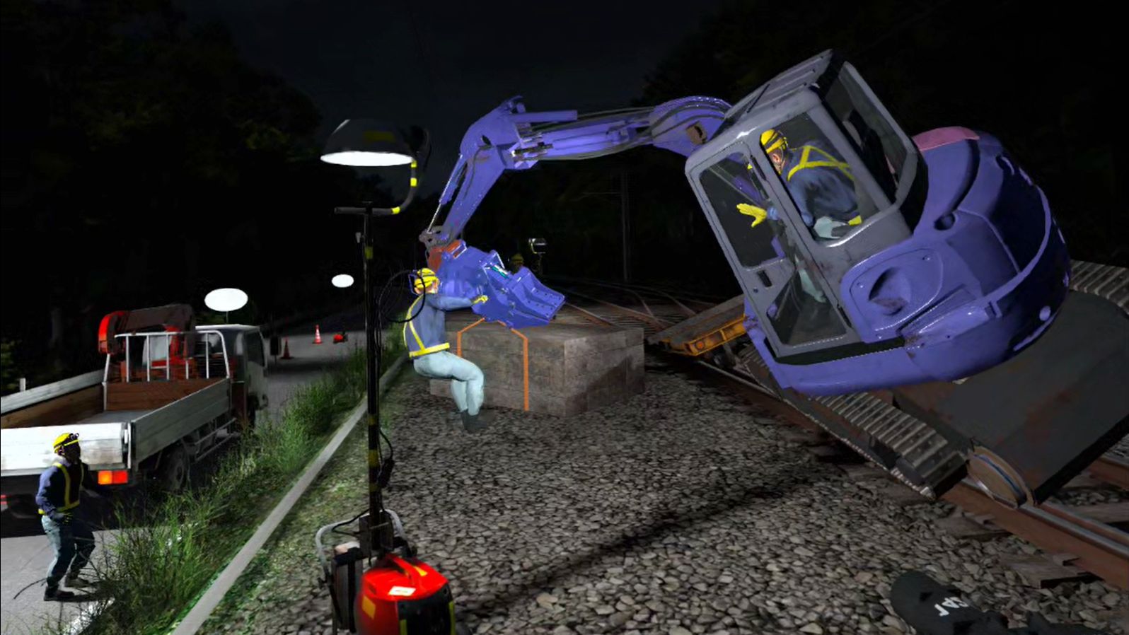 夜間のレール交換作業終了時、軌道検測装置等の資機材を線路上に置き忘れたまま線路開通確認を終了してしまうシナリオです。 照明の当て方や確認の不徹底が、貨物列車との衝突(限界支障)を招く恐怖を体験し、点検の重要性を学びます。