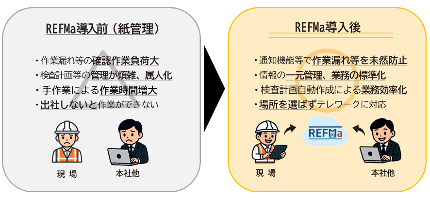 従来は紙ベースでの検査管理だったものが、REFMaの導入により、計画・検査・実績のデジタル化と一元管理による業務の標準化・効率化を実現し、ヒューマンエラーによる作業漏れなどの未然防止や業務のペーパーレス化に寄与しています。